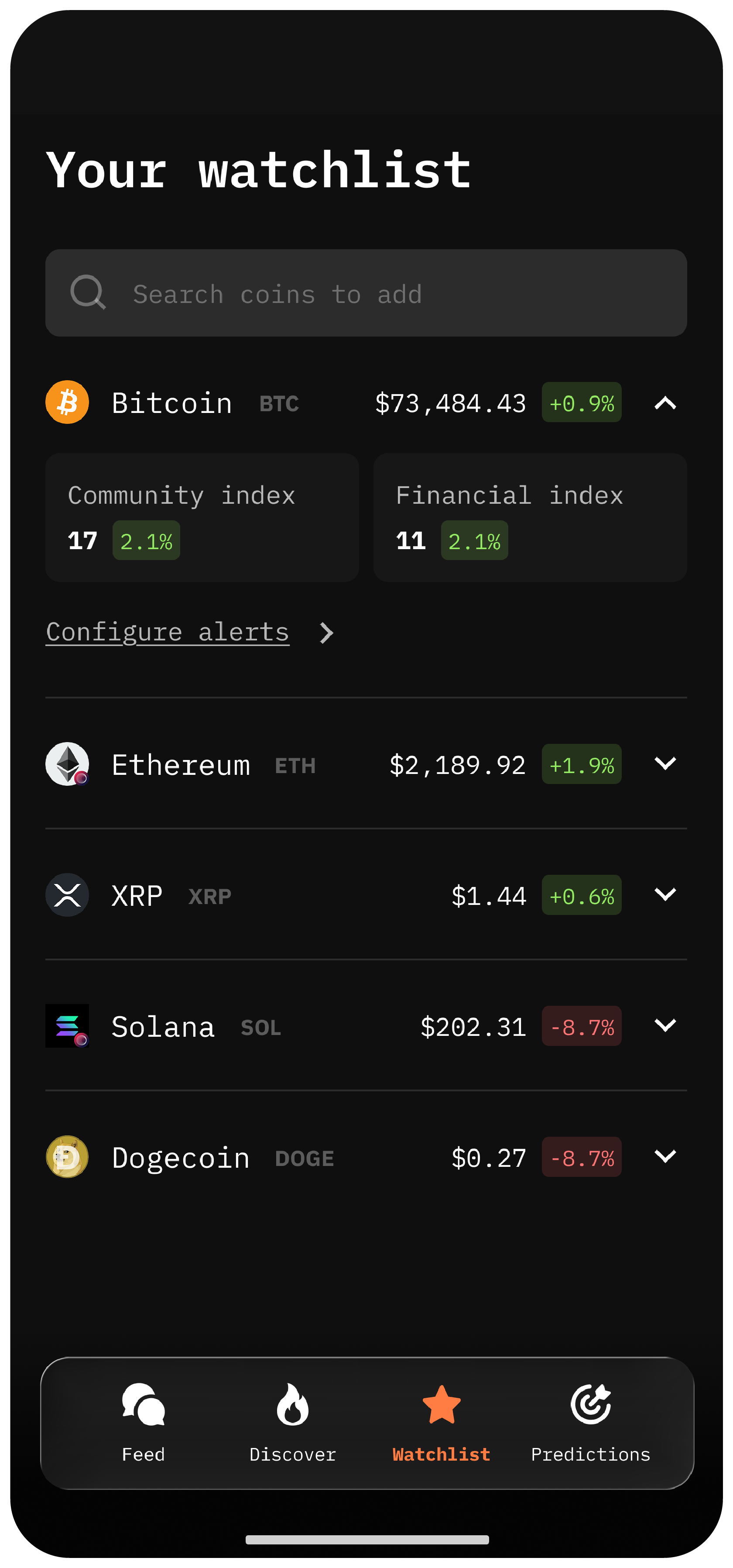 - Track portfolios and watchlists with smart alerts designed to detect early shifts in price, volatility, sentiment, trust, and market attention.